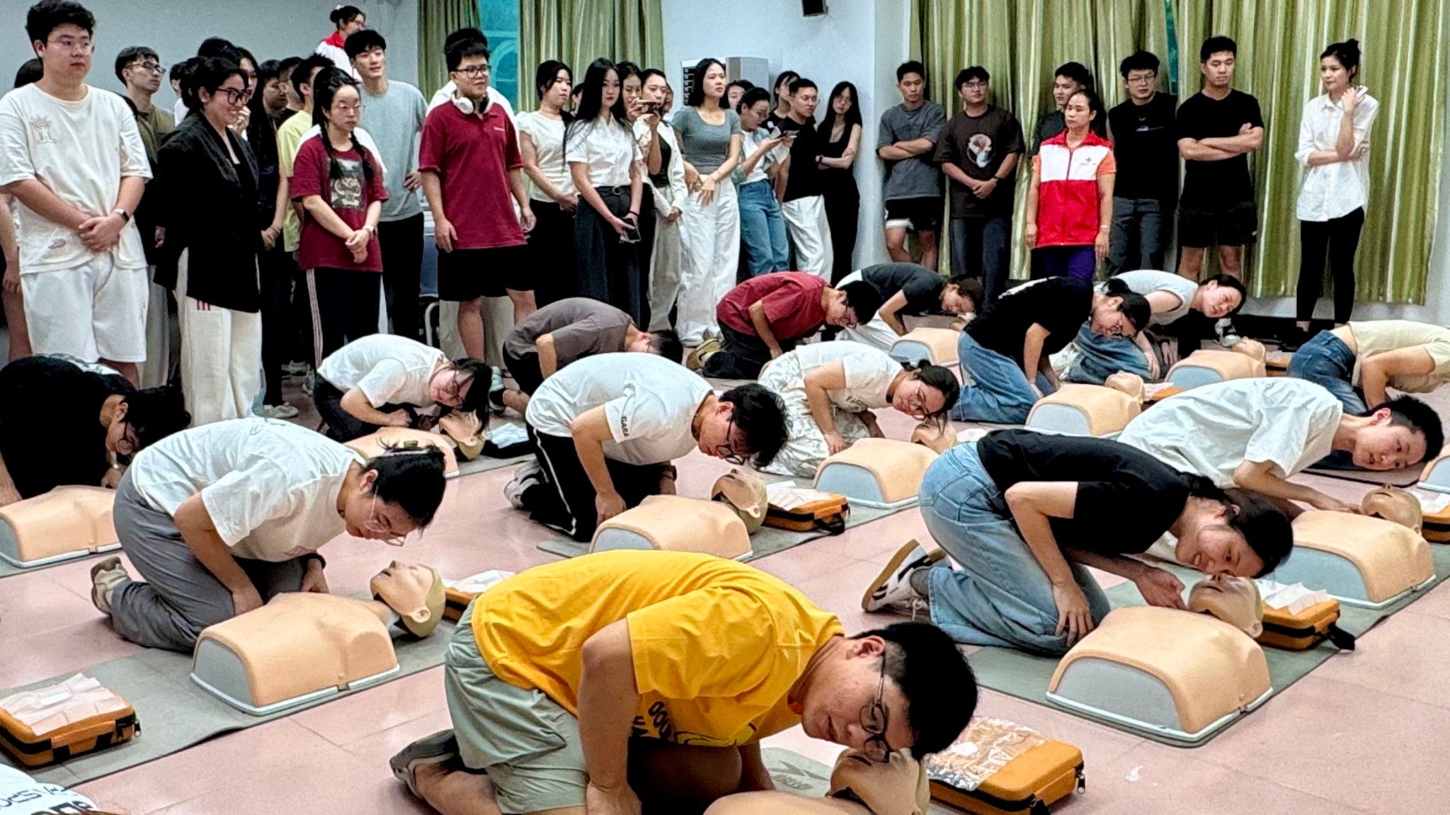 实操训练时,讲师借助模拟人,采用 “动作分解+易错点分析”的教学模式,对“胸外按压—开放气道—人工呼吸—AED操作”全流程进行细致入微的讲解与演示。学员们热情高涨,分组利用模拟人开展心肺复苏胸外按压、人工呼吸模拟练习。在模拟真实急救场景中,学员们迅速进入“红十字会救护员”角色,严格按照操作规范,精准控制按压深度、频率和呼吸节奏。针对创伤救护,学员们两人一组,在讲师指导下,学习多种包扎的实用技巧,从处理头部伤口的细致固定,到应对肢体创伤的快速止血包扎,学员们认真揣摩每个动作要领。讲师穿梭于训练场地,对学员操作中的细节问题逐一纠正,确保每位学员的动作达到专业标准。