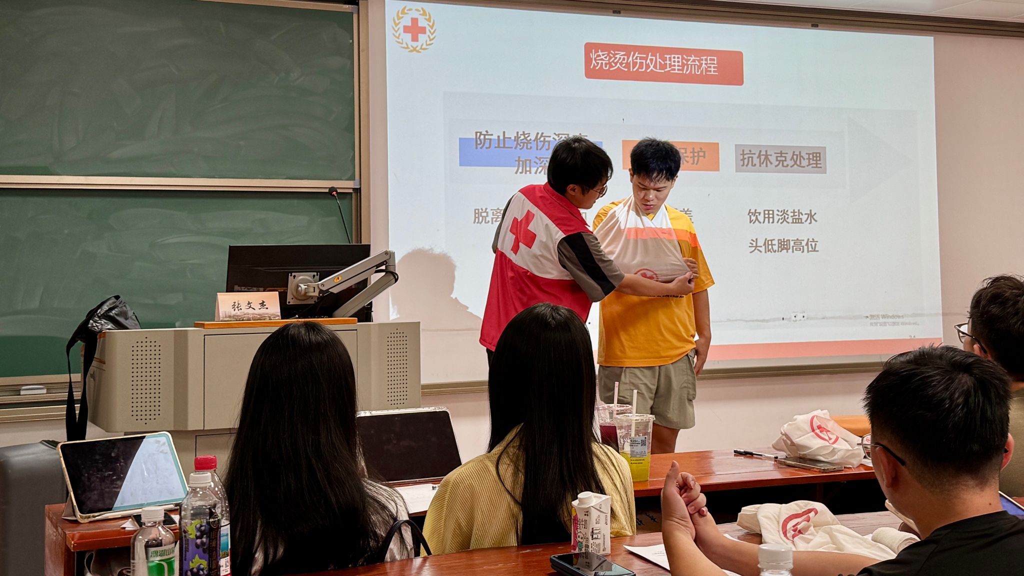 来自广东省红十字会东泽应急救护科普中心的资深讲师,凭借扎实的专业知识与丰富的实战经验,为学员们带来了一堂干货满满的理论课程。讲师们系统讲解了心脏复苏、自动体外除颤仪(AED)使用原理,气道异物梗阻急救方法,以及创伤止血、包扎、固定等基础救护操作流程,并针对各种常见急症和意外伤害,详细阐述应急处置要点。通过真实的案例分享,讲师们生动展现了在 “黄金四分钟” 等生死关头,及时、规范的急救措施如何稳定伤者生命体征,为后续抢救赢得宝贵时间,深刻诠释了急救知识在守护生命中的关键意义。
