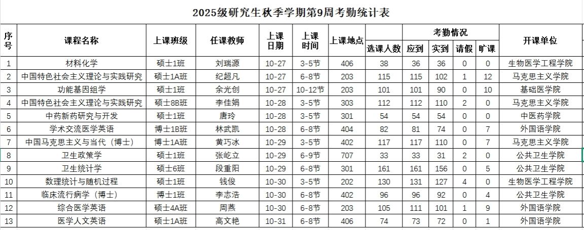 为进一步创建良好的学习氛围,培养和树立优良学风,维护学校正常的教学秩序,根据2025年研究生“学风考纪月”活动的安排,研究生院联合课程教学单位对部分课程进行了考勤抽查,现将第九周抽查结果公布如下: